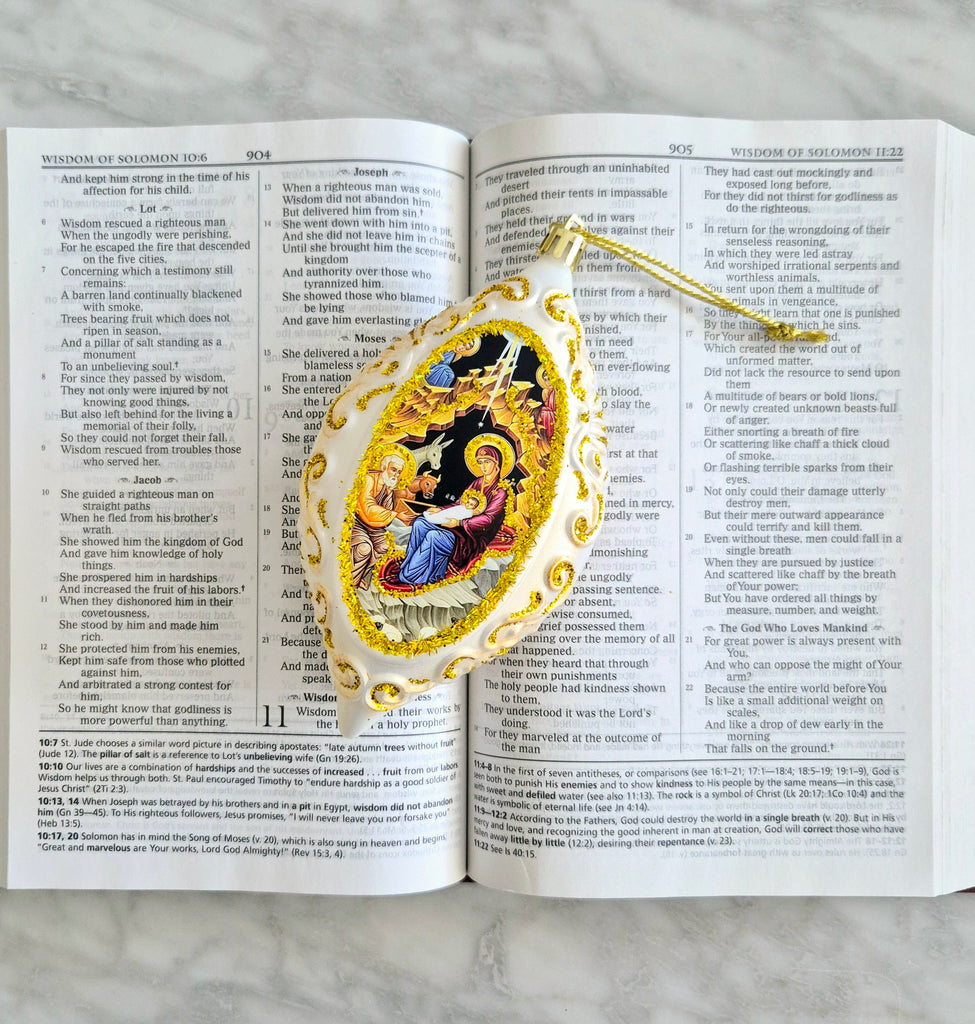 Bring the true spirit of Christmas to your tree with our handcrafted Christmas Nativity Ornament. Add a touch of tradition to your Christmas tree with our unique, handcrafted Ornament made in a beautiful gold and white tear drop shape featuring the orthodox icon of Nativity in the centre a stunning addition to your holiday decor.