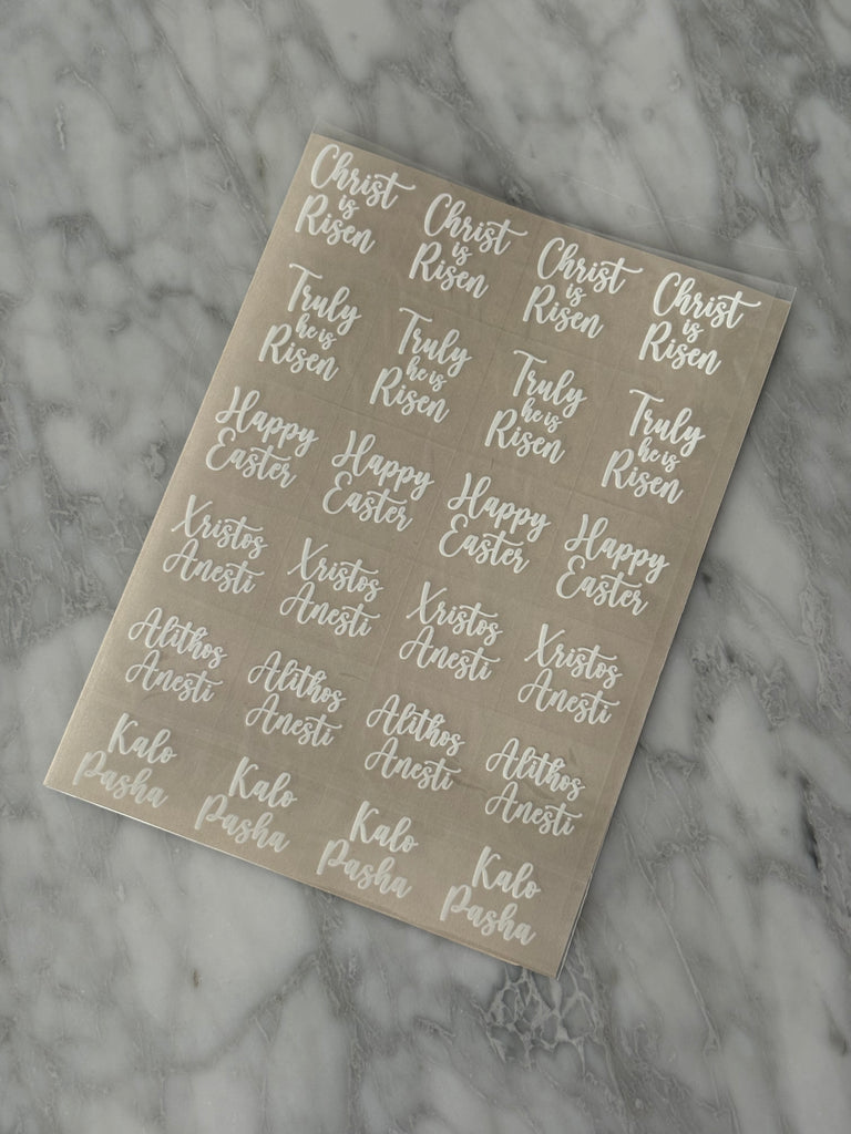 Now come in WHITE Orthodox English Easter egg Decals for decorating red eggs.