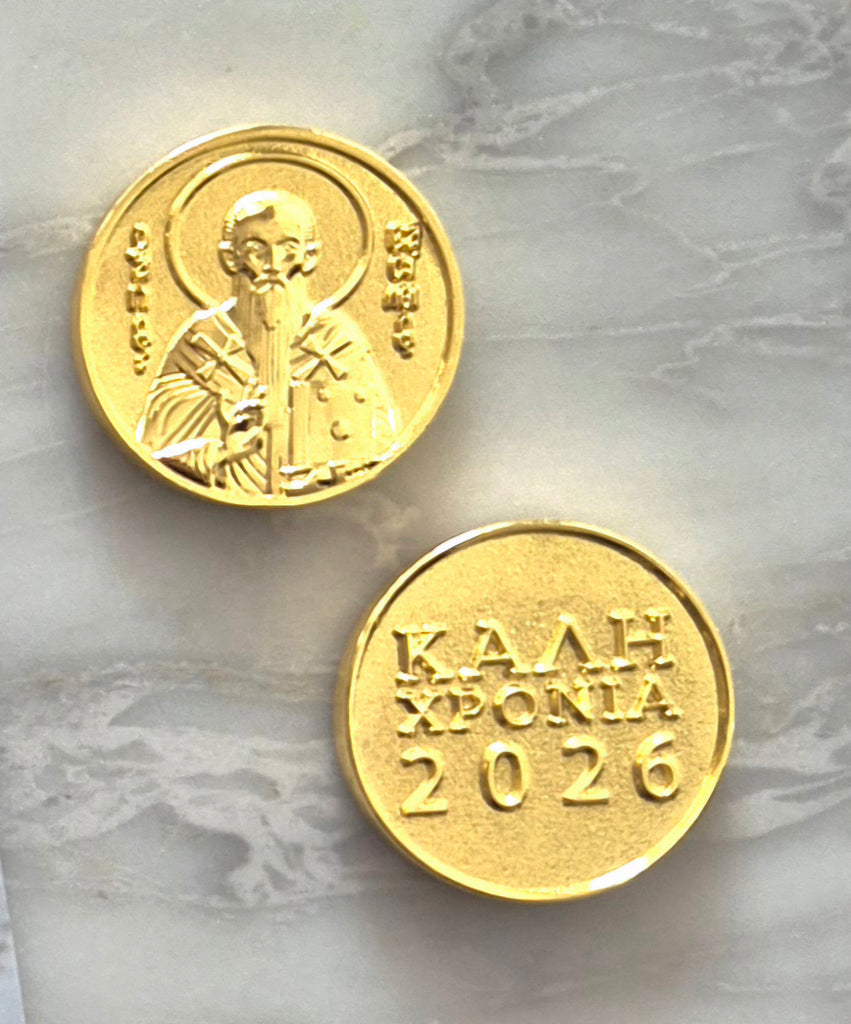 Our original designed flouri is stamped with Καλη Χρονια 2026 on one side and Saint Basil on the other as a keepsake gift for the winners and “good luck” for the year.