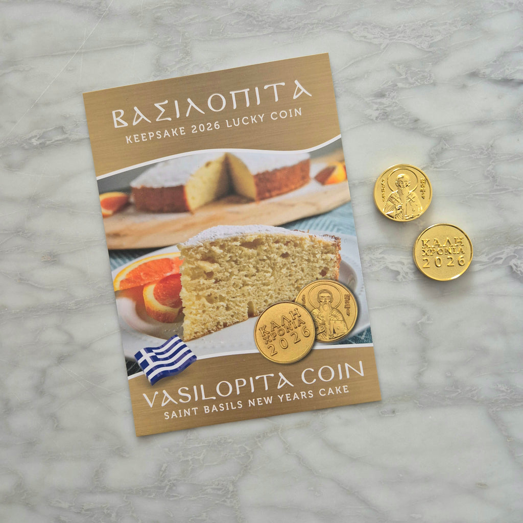 Continue the Greek tradition of welcoming in the New Year with your family with a Vasilopita cake and the luckiest Καλη Χρονια (Kali Hronia) gold flouri (coin)